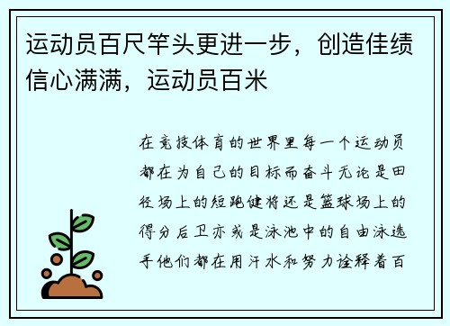 在竞技体育的世界里,每一个运动员都在为自己的目标而奋斗。无论是田径场上的短跑健将,还是篮球场上的得分后卫,亦或是泳池中的自由泳选手,他们都在用汗水和努力诠释着“百尺竿头更进一步”的精神。这种精神不仅体现在他们的训练中,更深深植根于他们的内心...