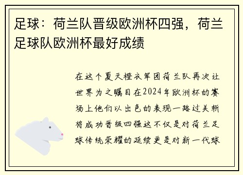 足球:荷兰队晋级欧洲杯四强,荷兰足球队欧洲杯最好成绩