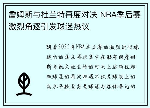 詹姆斯与杜兰特再度对决 NBA季后赛激烈角逐引发球迷热议