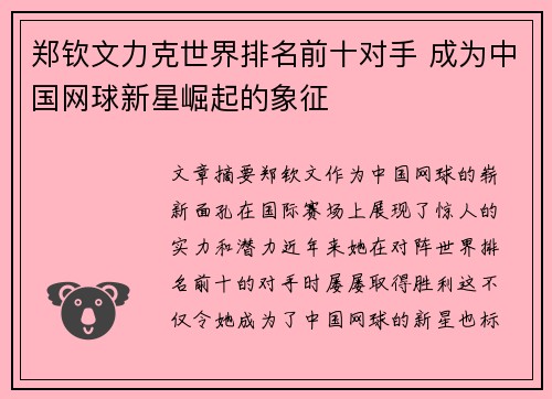 郑钦文力克世界排名前十对手 成为中国网球新星崛起的象征