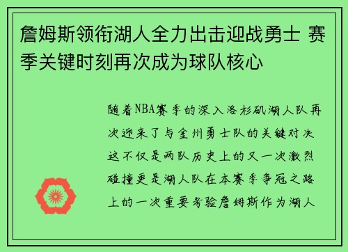 詹姆斯领衔湖人全力出击迎战勇士 赛季关键时刻再次成为球队核心