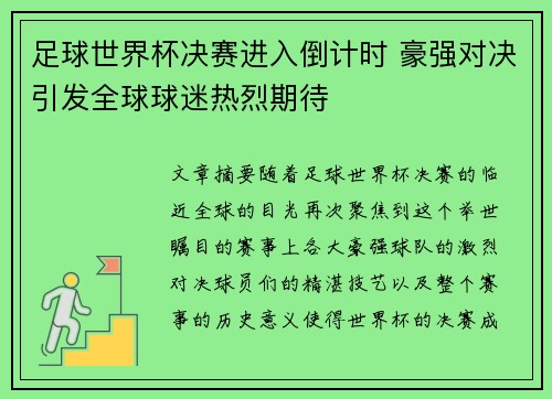 足球世界杯决赛进入倒计时 豪强对决引发全球球迷热烈期待