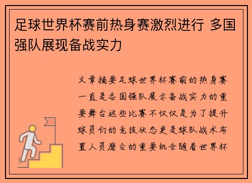 文章摘要:足球世界杯赛前的热身赛,一直是各国强队展示备战实力的重要舞台。这些比赛不仅仅是为了提升球员们的竞技状态,更是球队战术布置、人员磨合的重要机会。随着世界杯的临近,多国强队纷纷展开了紧张的热身赛,通过这些比赛,球迷们能够看到各支球队的...