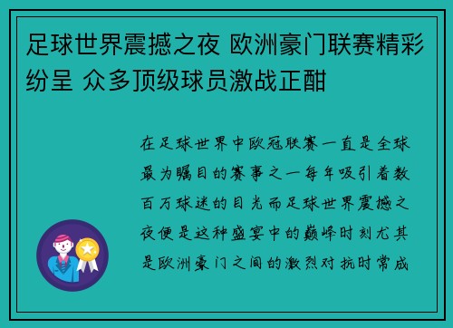 足球世界震撼之夜 欧洲豪门联赛精彩纷呈 众多顶级球员激战正酣