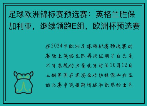 在2024年欧洲足球锦标赛预选赛的赛场上,英格兰队再次证明了自己是不可忽视的力量。北京时间10月12日,三狮军团在客场面对劲敌保加利亚的比赛中,凭借斯特林和凯恩的出色表现,以3-1的比分锁定胜局。这场胜利不仅让英格兰队在E组中继续保持领跑地...