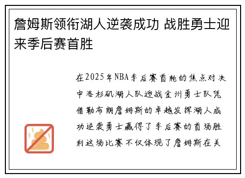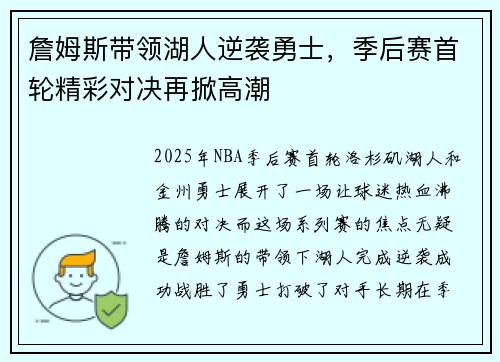 文章摘要的内容:詹姆斯领衔湖人迎战劲敌勇士,勇敢追逐季后赛梦想,展现了他们的顽强拼搏精神。本文从四个方面深入探讨:首先,分析詹姆斯的领导力和影响力;其次,探讨湖人队的战术和团队配合;然后,关注勇士队的挑战与应对策略;最后,总结詹姆斯在季后赛...