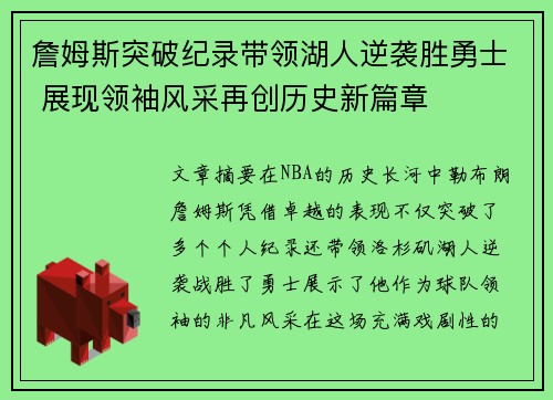 詹姆斯突破纪录带领湖人逆袭胜勇士 展现领袖风采再创历史新篇章