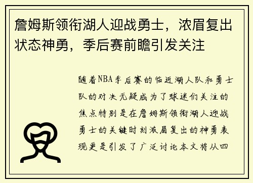 随着NBA季后赛的临近,湖人队和勇士队的对决无疑成为了球迷们关注的焦点。特别是在詹姆斯领衔湖人迎战勇士的关键时刻,浓眉复出的神勇表现更是引发了广泛讨论。本文将从四个方面详细分析詹姆斯和浓眉的状态,以及这场比赛对季后赛前景的影响。首先,我们将...