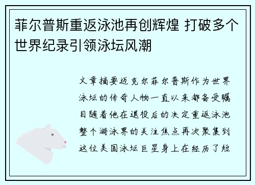 菲尔普斯重返泳池再创辉煌 打破多个世界纪录引领泳坛风潮
