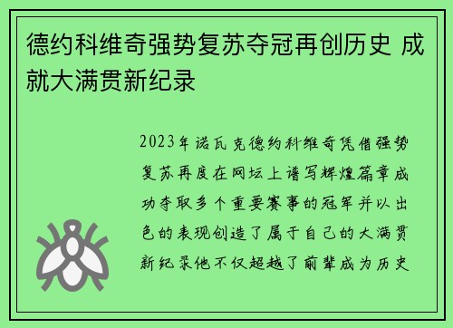 德约科维奇强势复苏夺冠再创历史 成就大满贯新纪录