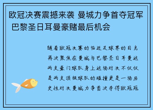 欧冠决赛震撼来袭 曼城力争首夺冠军 巴黎圣日耳曼豪赌最后机会