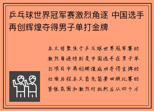 乒乓球世界冠军赛激烈角逐 中国选手再创辉煌夺得男子单打金牌