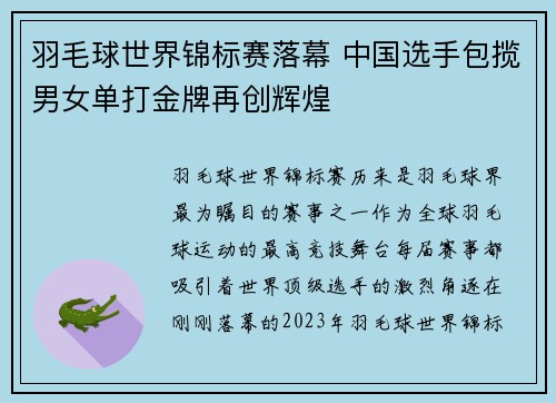 羽毛球世界锦标赛历来是羽毛球界最为瞩目的赛事之一,作为全球羽毛球运动的最高竞技舞台,每届赛事都吸引着世界顶级选手的激烈角逐。在刚刚落幕的2023年羽毛球世界锦标赛中,中国选手再创辉煌,包揽了男女单打金牌。这一成果不仅体现了中国羽毛球运动员在...