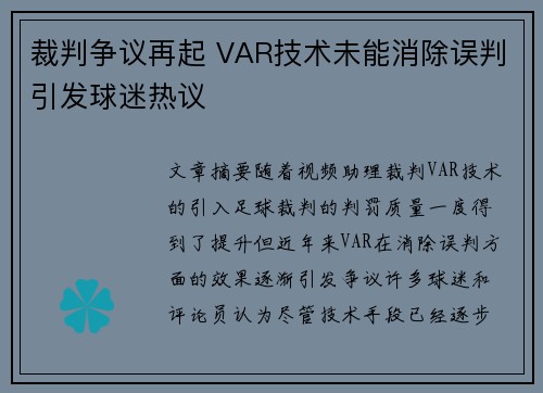 裁判争议再起 VAR技术未能消除误判引发球迷热议
