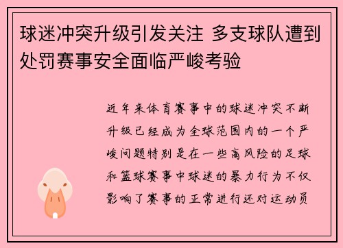 球迷冲突升级引发关注 多支球队遭到处罚赛事安全面临严峻考验
