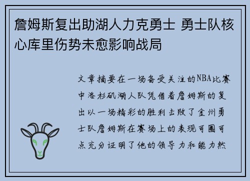 詹姆斯复出助湖人力克勇士 勇士队核心库里伤势未愈影响战局