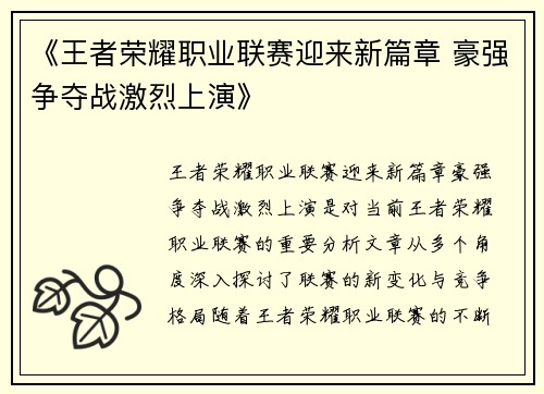 《王者荣耀职业联赛迎来新篇章 豪强争夺战激烈上演》