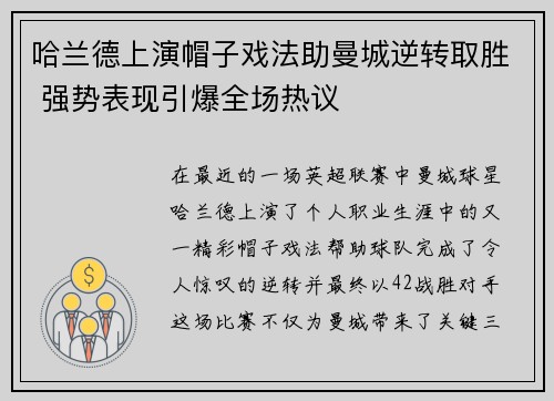 哈兰德上演帽子戏法助曼城逆转取胜 强势表现引爆全场热议