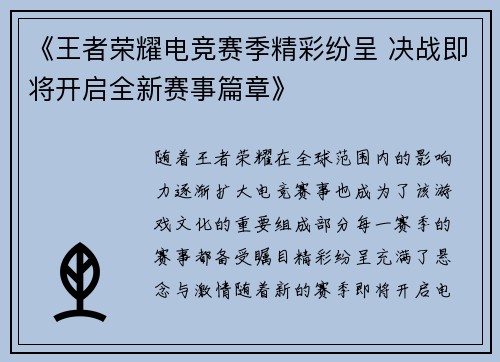 《王者荣耀电竞赛季精彩纷呈 决战即将开启全新赛事篇章》