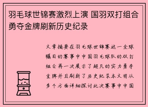 文章摘要:在羽毛球世锦赛这一全球瞩目的赛事中,中国羽毛球队的双打组合再一次展示了超凡的实力,勇夺金牌,并且刷新了历史纪录。本文将从多个方面详细探讨此次赛事中中国羽毛球双打组合的精彩表现及其背后的历史意义。首先,将分析本届羽毛球世锦赛的赛事背...