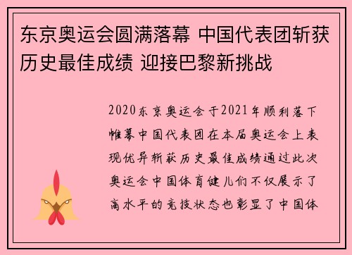 东京奥运会圆满落幕 中国代表团斩获历史最佳成绩 迎接巴黎新挑战