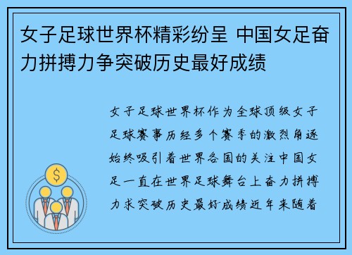 女子足球世界杯作为全球顶级女子足球赛事,历经多个赛季的激烈角逐,始终吸引着世界各国的关注。中国女足一直在世界足球舞台上奋力拼搏,力求突破历史最好成绩。近年来,随着中国女足的实力逐步提升,球队的表现也愈加精彩。本文将围绕女子足球世界杯的精彩纷...