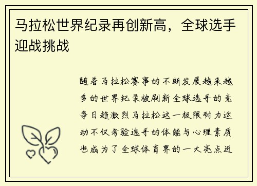 马拉松世界纪录再创新高,全球选手迎战挑战