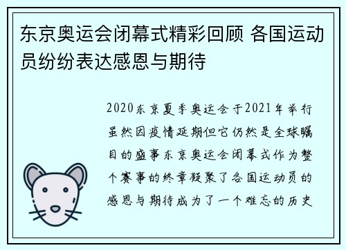 东京奥运会闭幕式精彩回顾 各国运动员纷纷表达感恩与期待