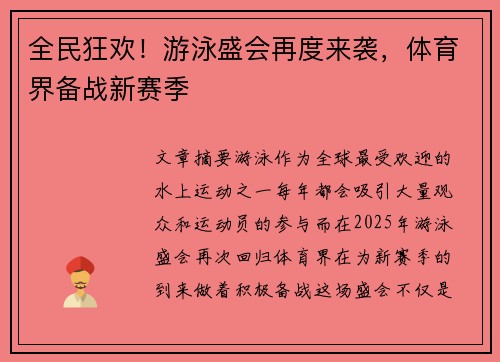 全民狂欢!游泳盛会再度来袭,体育界备战新赛季