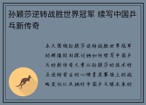 孙颖莎逆转战胜世界冠军 续写中国乒乓新传奇