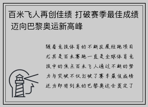 随着竞技体育的不断发展,短跑项目,尤其是百米赛跑,一直是全球体育竞技中的焦点。百米飞人通过不断的努力与突破,不仅打破了赛季最佳成绩,还为即将到来的巴黎奥运会奠定了坚实的基础。在这个过程中,百米飞人不单单是在身体素质的提升上有所突破,更是在心...