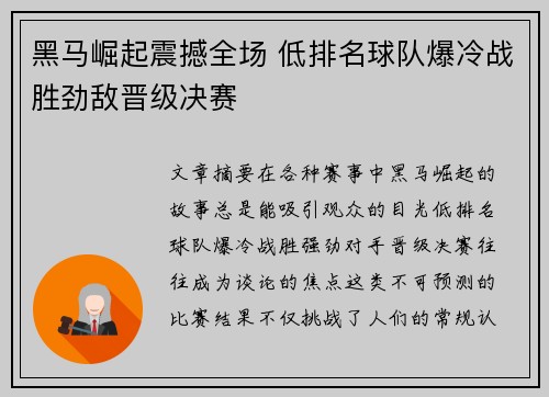 黑马崛起震撼全场 低排名球队爆冷战胜劲敌晋级决赛