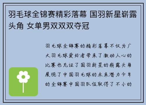 羽毛球全锦赛精彩落幕 国羽新星崭露头角 女单男双双双夺冠