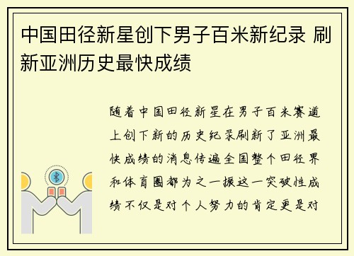 中国田径新星创下男子百米新纪录 刷新亚洲历史最快成绩