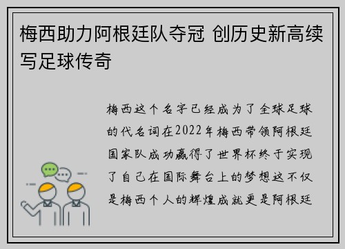 梅西助力阿根廷队夺冠 创历史新高续写足球传奇