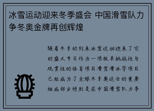 冰雪运动迎来冬季盛会 中国滑雪队力争冬奥金牌再创辉煌