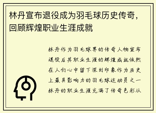 林丹宣布退役成为羽毛球历史传奇,回顾辉煌职业生涯成就