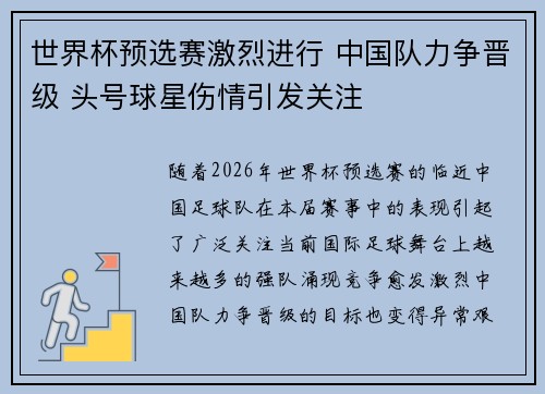 世界杯预选赛激烈进行 中国队力争晋级 头号球星伤情引发关注