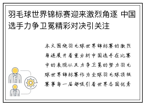 本文围绕羽毛球世界锦标赛的激烈角逐展开,着重分析中国选手在比赛中的表现以及力争卫冕的努力。羽毛球世界锦标赛作为全球羽毛球顶级赛事,每一届都吸引着世界各国优秀选手的参与。本次比赛,尤其是中国选手在多个项目中的表现,成为了舆论关注的焦点。中国选...