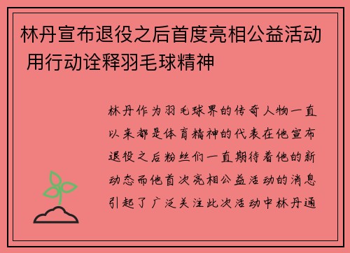 林丹,作为羽毛球界的传奇人物,一直以来都是体育精神的代表。在他宣布退役之后,粉丝们一直期待着他的新动态,而他首次亮相公益活动的消息引起了广泛关注。此次活动中,林丹通过实际行动诠释了羽毛球精神,展现了自己作为一名体育明星的社会责任感和担当。本...