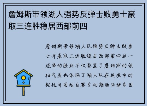 詹姆斯带领湖人队强势反弹,击败勇士并豪取三连胜,稳居西部前四。这一连串的胜利不仅彰显了詹姆斯的领袖气质,也体现了湖人队在逆境中的韧性与团结。自赛季初期面临诸多困境以来,湖人通过一系列战术调整和球员的默契配合,逐渐找回状态,尤其是在詹姆斯的带...