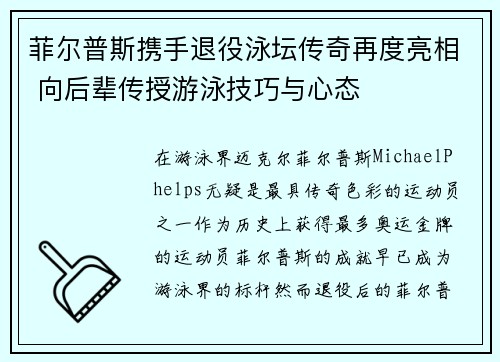 在游泳界,迈克尔·菲尔普斯(Michael Phelps)无疑是最具传奇色彩的运动员之一。作为历史上获得最多奥运金牌的运动员,菲尔普斯的成就早已成为游泳界的标杆。然而,退役后的菲尔普斯并未完全脱离泳坛,他依旧在不同场合分享自己的经验与知识。...