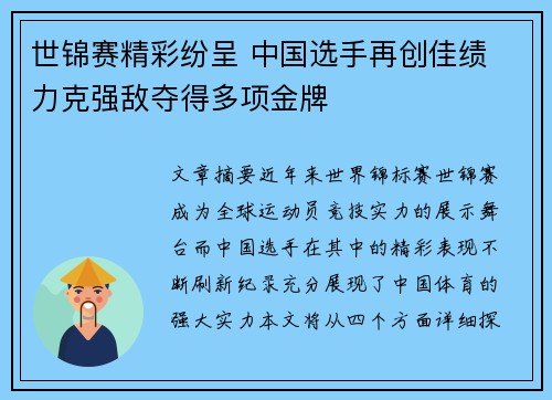 世锦赛精彩纷呈 中国选手再创佳绩 力克强敌夺得多项金牌