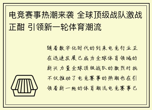 电竞赛事热潮来袭 全球顶级战队激战正酣 引领新一轮体育潮流