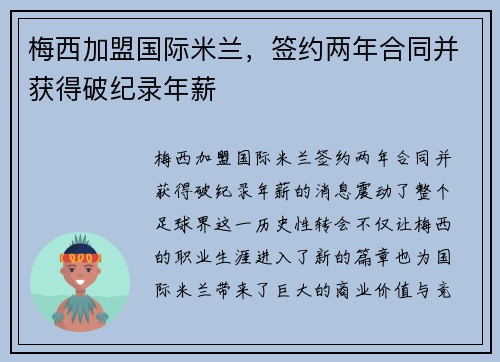 梅西加盟国际米兰,签约两年合同并获得破纪录年薪