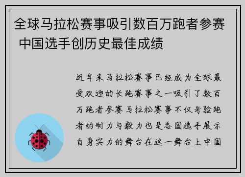 近年来,马拉松赛事已经成为全球最受欢迎的长跑赛事之一,吸引了数百万跑者参赛。马拉松赛事不仅考验跑者的耐力与毅力,也是各国选手展示自身实力的舞台。在这一舞台上,中国选手的表现愈加突出,尤其是在近年来,中国选手创造了历史性的好成绩。本文将从全球...