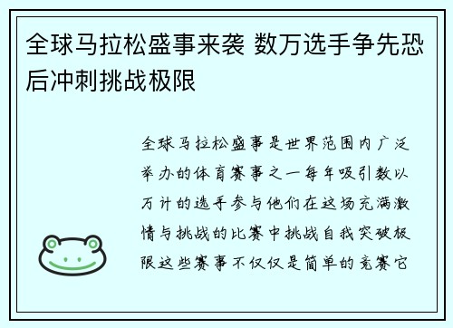 全球马拉松盛事是世界范围内广泛举办的体育赛事之一,每年吸引数以万计的选手参与,他们在这场充满激情与挑战的比赛中,挑战自我、突破极限。这些赛事不仅仅是简单的竞赛,它们成为了全球健身爱好者、跑步者和运动员展示毅力与耐力的舞台。数万选手在全世界不...