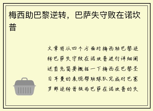 文章将从四个方面对梅西助巴黎逆转,巴萨失守败在诺坎普进行详细阐述。首先简要概括一下:梅西在巴黎圣日耳曼的表现帮助球队完成对巴塞罗那逆转晋级,而巴萨在诺坎普的失利彰显了球队的不足之处,成为焦点。本文分为四个部分展开详细阐述。1、梅西在比赛中的...