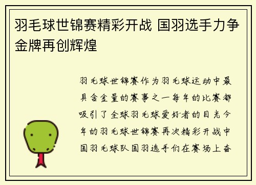 羽毛球世锦赛作为羽毛球运动中最具含金量的赛事之一,每年的比赛都吸引了全球羽毛球爱好者的目光。今年的羽毛球世锦赛再次精彩开战,中国羽毛球队(国羽)选手们在赛场上奋勇拼搏,力争金牌,展现出中国羽毛球的强大实力。本文将从四个方面详细探讨羽毛球世锦...