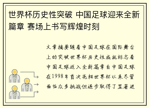 世界杯历史性突破 中国足球迎来全新篇章 赛场上书写辉煌时刻